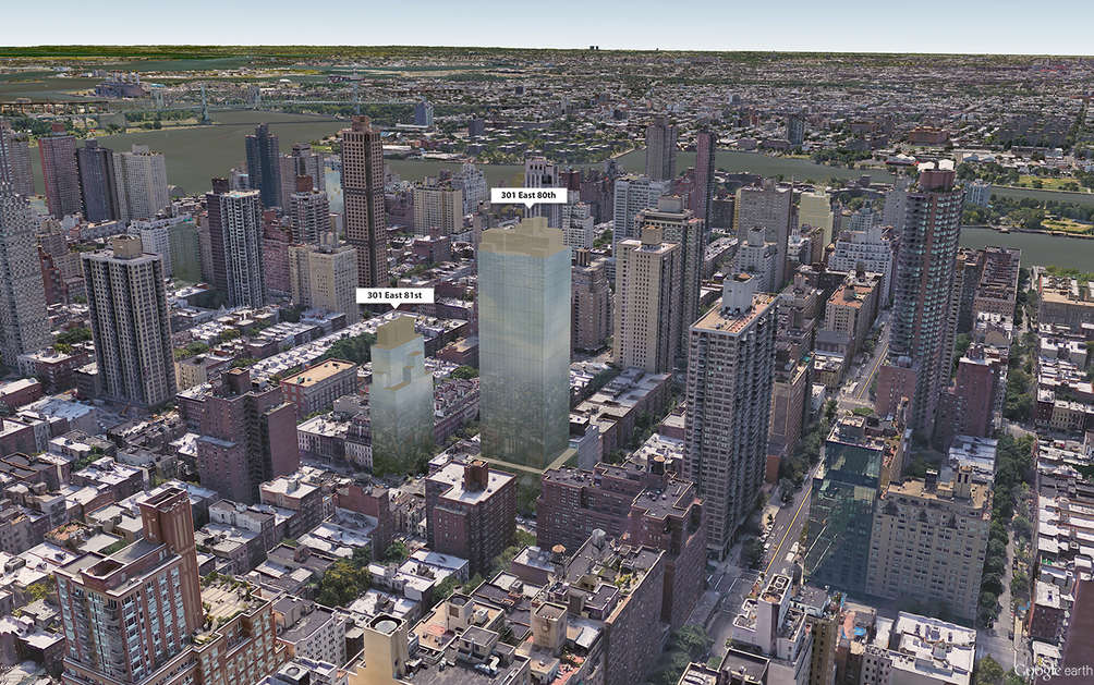 Icon, led by Terrence Lowenberg and Todd Cohen, submitted plans to the city for a pair of towers several years ago but have yet to fully reveal what exactly is in store. But now with construction permits fully approved, zoning diagrams have been made public showing us the scale and massing of the towers. The diagrams are also posted on-site where the taller building at 301 East 80th Street just reached street level and its shorter sister at 301 East 81st Street is about ten floors up.”